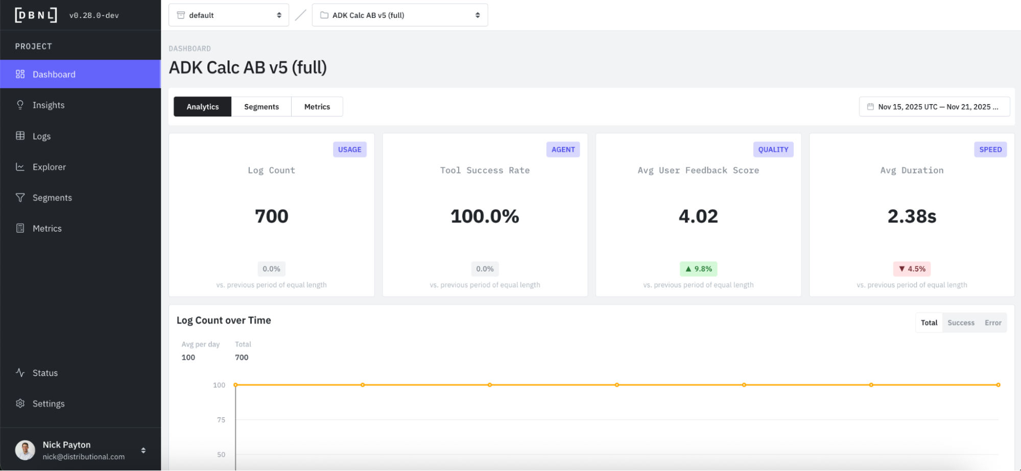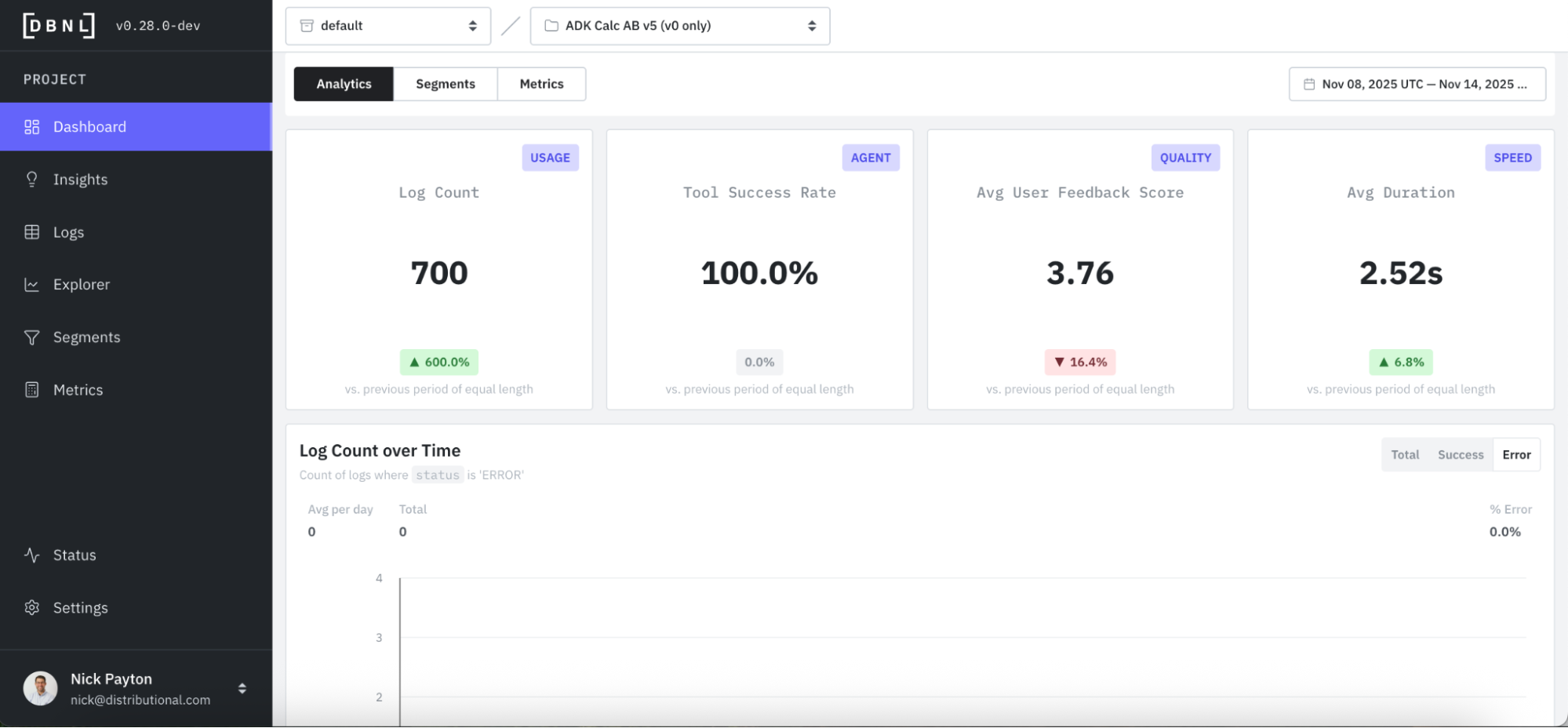 DBNL makes sense of production AI logs with analytics that tell a deeper, more complete story on cost, speed, quality, and usage of the AI agent.