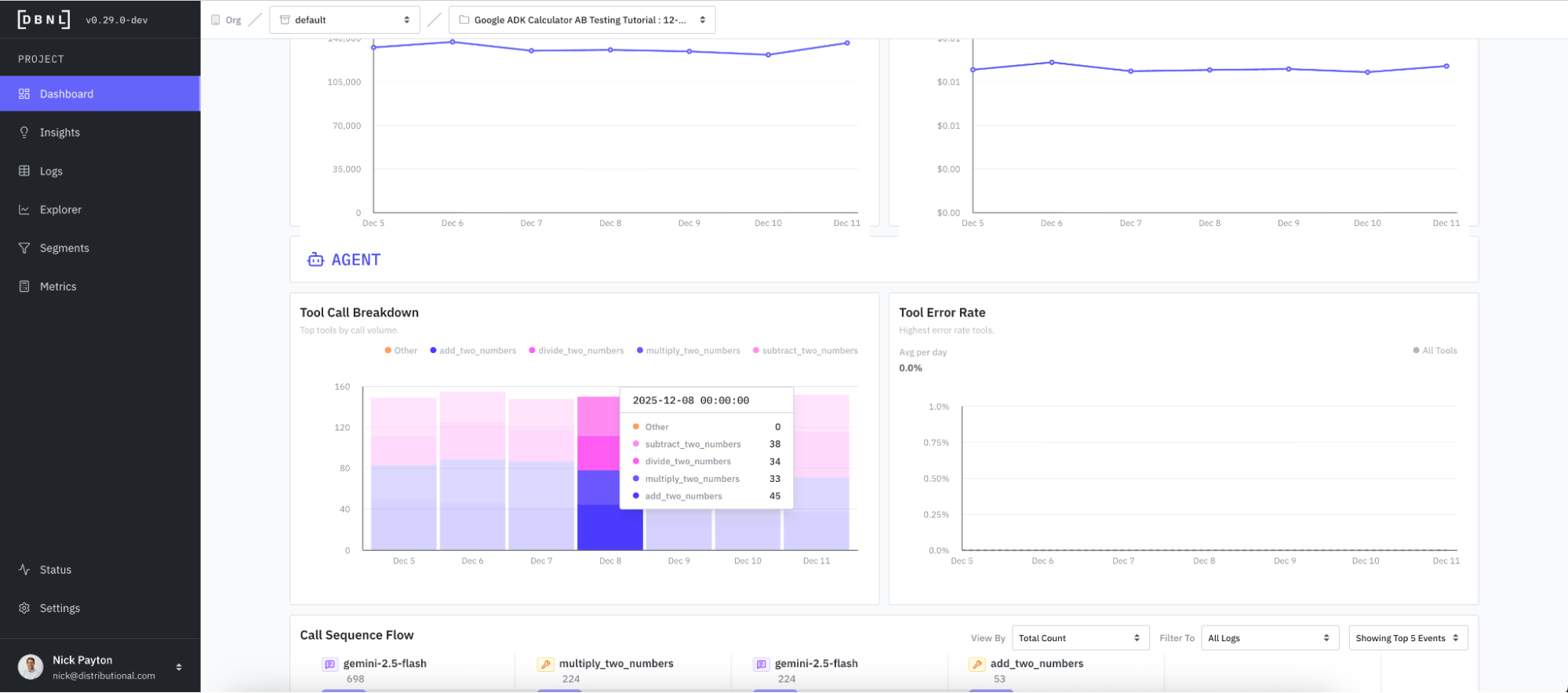 And DBNL visualizes the tool call sequence flow to provide deeper understanding of how the agent is using these tools and more intuitive debugging of issues around agent performance. This call sequence flow can also be viewed, filtered, and grouped by a variety of attributes so you can get a quick sense of whether the agent is performing as expected.
