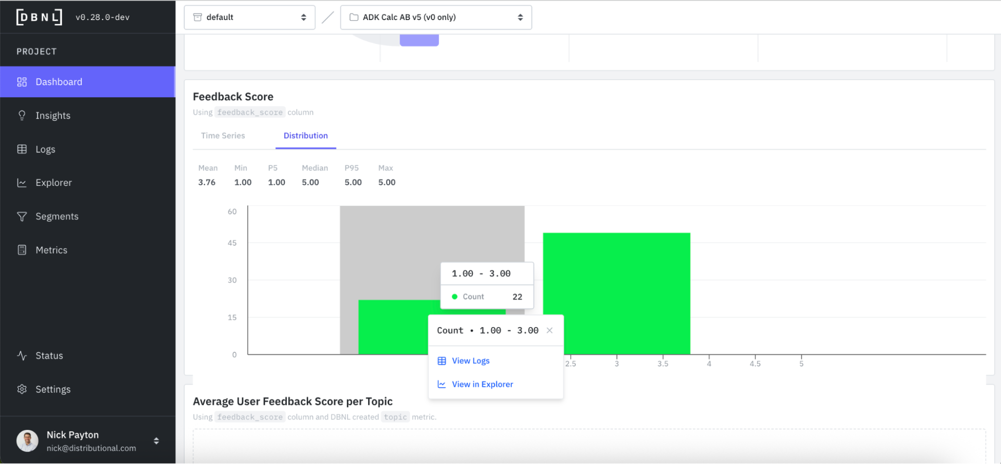We already passively saw a signal that suggested a potential issue to investigate. Feedback scores seemed to be lower than expected, and lower than recent averages. In this same Dashboard, you can go deeper on feedback scores by looking at time series and distributions. For quick investigation, you can also directly click into logs or explorer, which we will show in the next section.