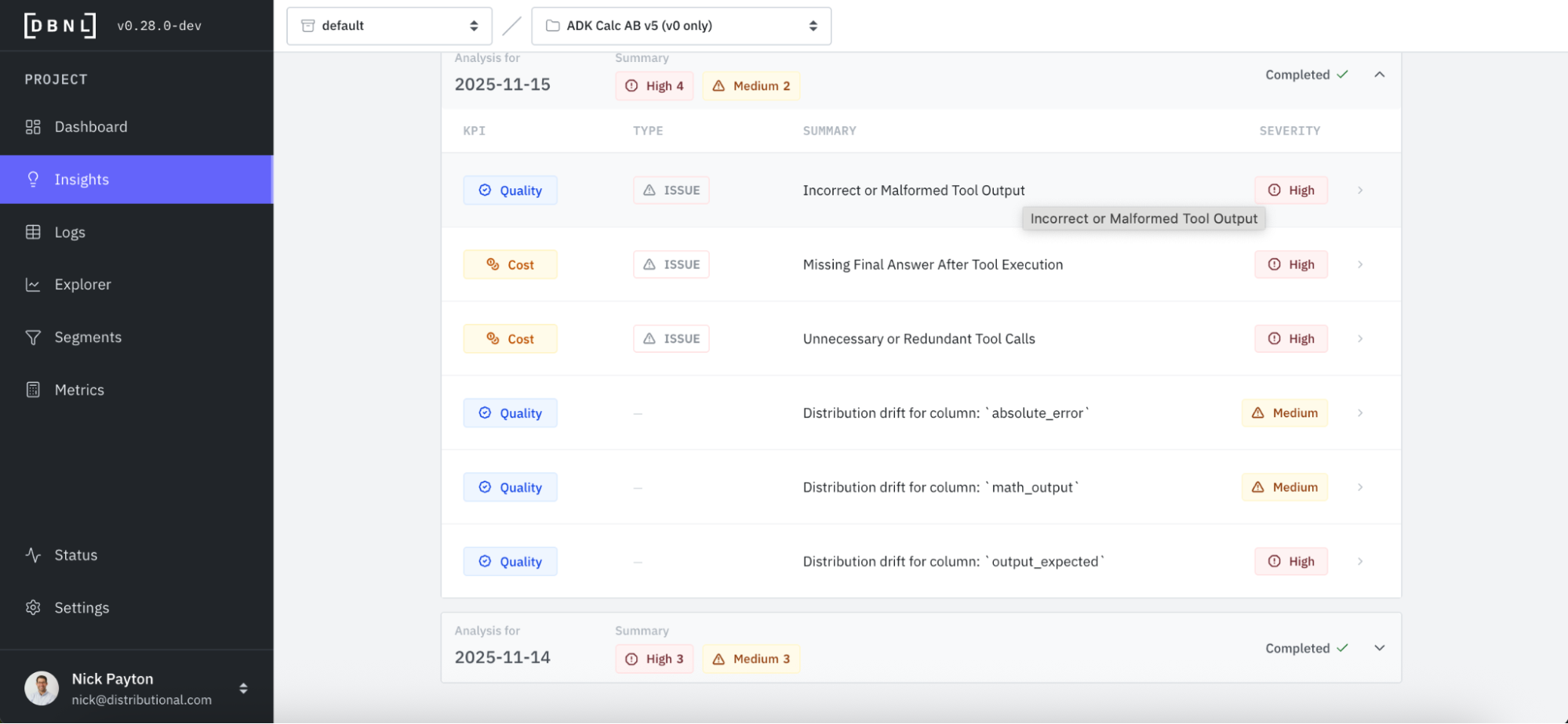 DBNL also offers a more proactive way to discover issues that also serves to more rapidly jumpstart investigation. Every day, DBNL produces Insights that are human readable summaries of signals the product found hidden in your production AI logs. These Insights can be found in your Dashboard or through Notification Connections that you configure. In this case, we immediately see the Incorrect or Malformed Tool Output issue is high severity and worth investigating, listed first in the Insights from this day.