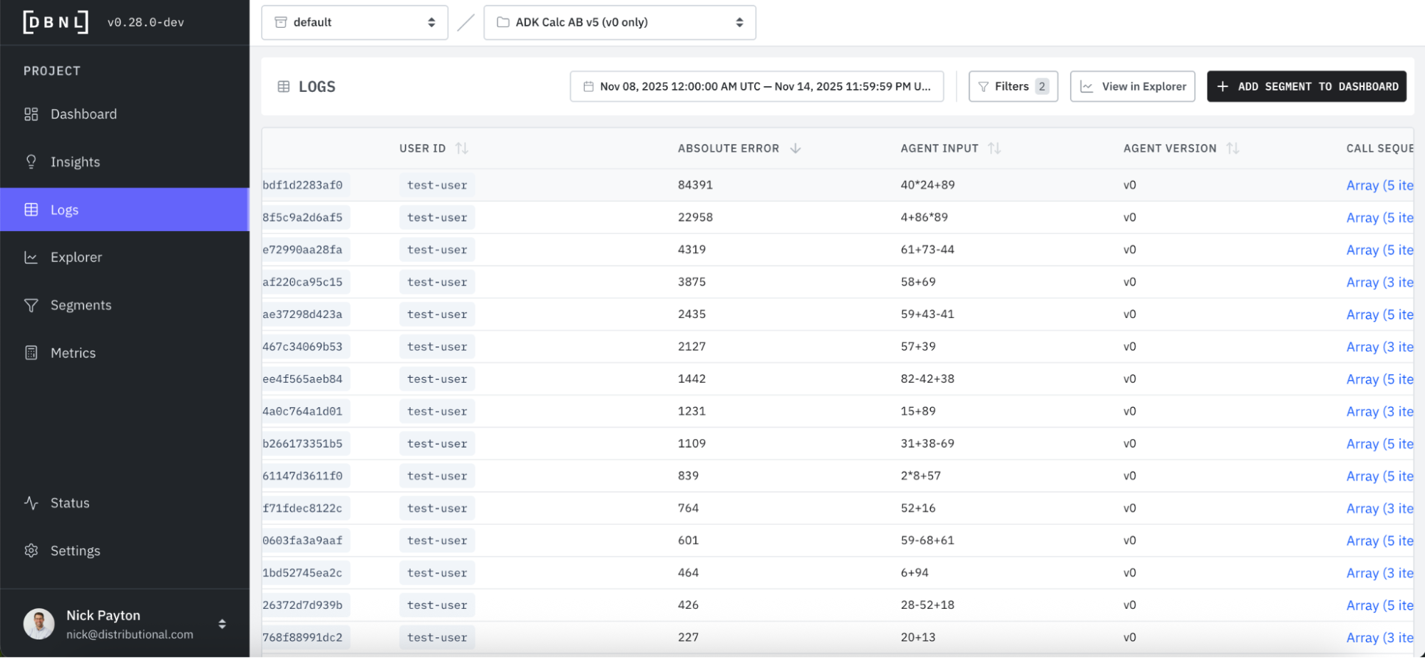 To simplify this example, we built an LLM-based calculator agent that calls tools to add, subtract, multiply, and divide numbers. We generated a wide variety of math strings and ran these as queries to this calculator. We then intentionally introduced a bug in one of the tools for DBNL to automatically discover. We logged these traces and augmented them with a variety of properties:
