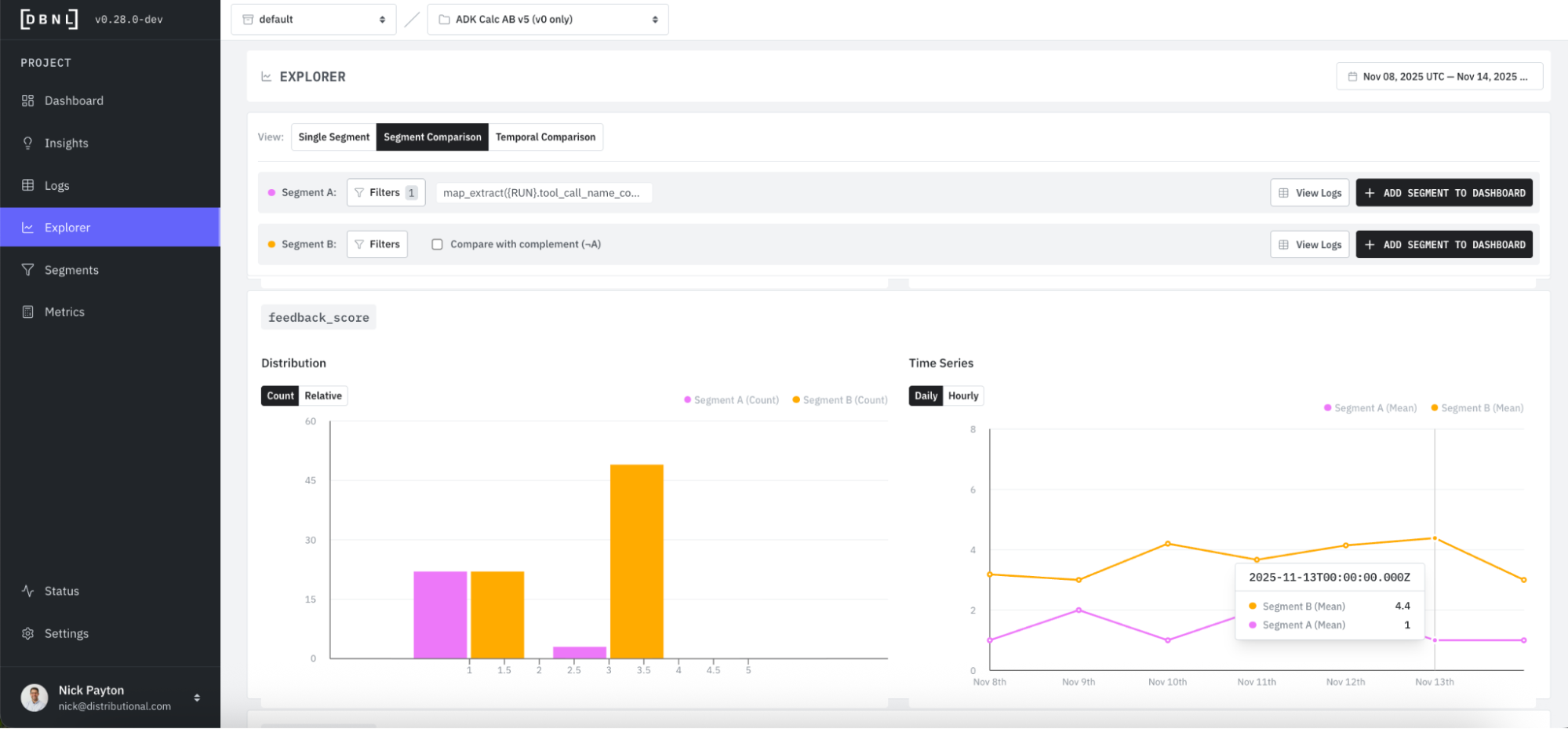 For this calculator, we are able to extract the cohort each trace belongs to by tracking the product version as an attribute. When we made the fix, we created two versions of the agent, v0 to v1, and we can now filter on this attribute in Explorer and compare Segment A (pink, v0) to Segment B (orange, v1).