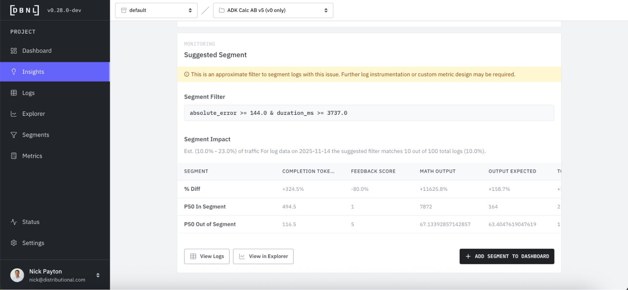 return {"status": "ok", "result": a * b}Alongside DBNL’s recommendations for fixes, DBNL also suggests segments you can track so that you can keep tabs on an issue you want to triage later, ensure a fix actually addresses an issue, and ensure that resolved issues don’t reemerge. By adding a new Segment, DBNL will add this to the Segments Dashboard and provide Insights on it going forward.