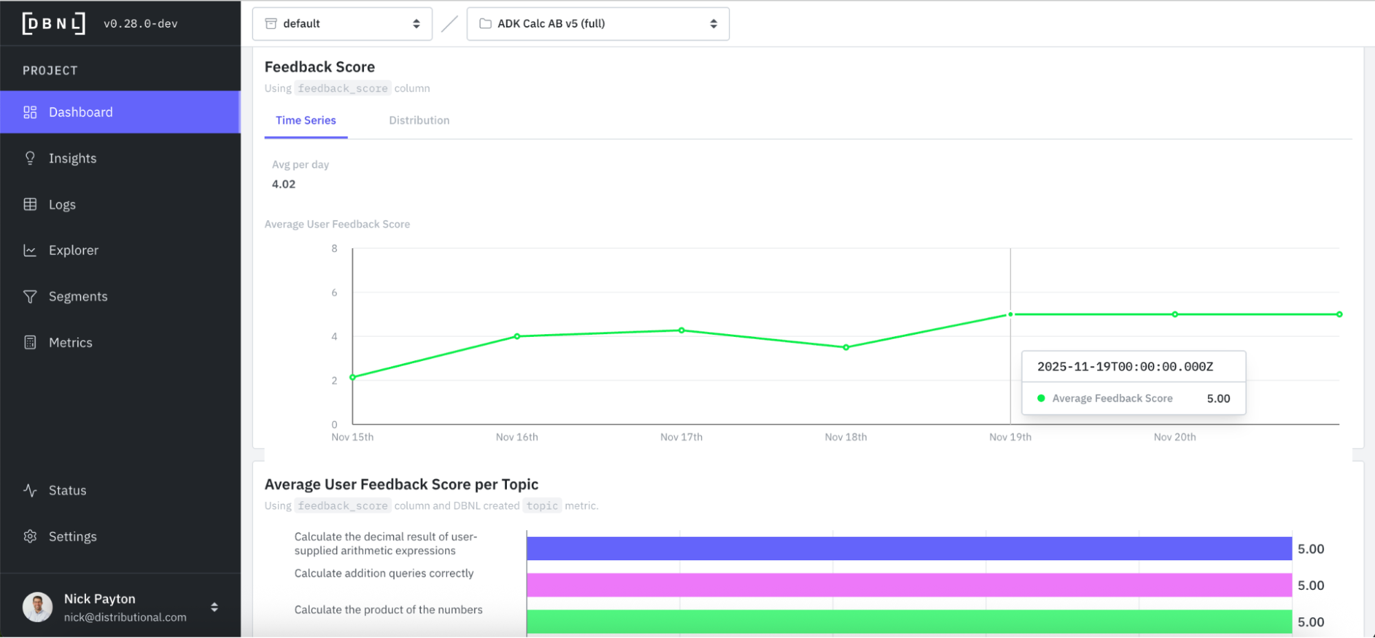 We ran this calculator for 7 days with synthetically generated queries, at which point DBNL began producing daily insights on cost, quality, speed, and usage of the agent. (Typically AI product teams backfill with historical data to get started with DBNL much faster.)