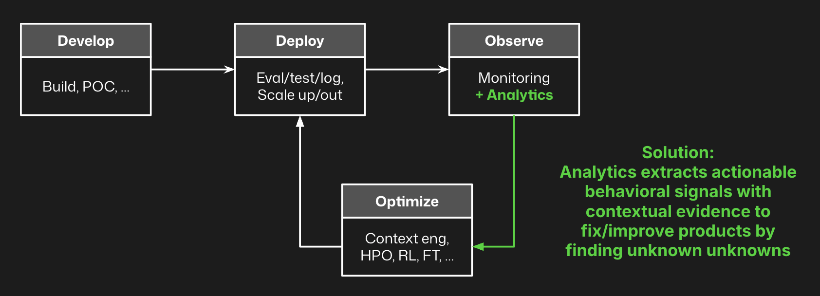 AI product teams use analytics to identify clusters, correlations, patterns, or other interesting insights on agent behavior, and then develop evals off of these insights. Whenever they create a new eval, they add that to the combination of metrics that are assessed by the analytics solution, building richer and richer data for this analysis over time.